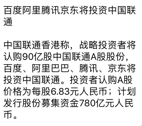 今天突发利好,中国联通终于公布了混改方案,昨天天突然对并购重组发言,说要服务于国改,都是套路。我反复强调国改,明天等着突突突吧。阿里、京东、百度、腾讯这些活力公司去拥抱联通,是不是真的能让僵尸起死回生?(有一种豆蔻少女错配90高龄老翁的既视感,而且是4个一块上,不知道老翁招架得住吗?)这次阿里认购的最低,腾讯最多,可能腾讯本身是社交主营有关,但背后我觉得马云不想趟这摊浑水。混改最后的结果不知道,但明天相关题材一定会被炒上天,包括复牌后的联通。