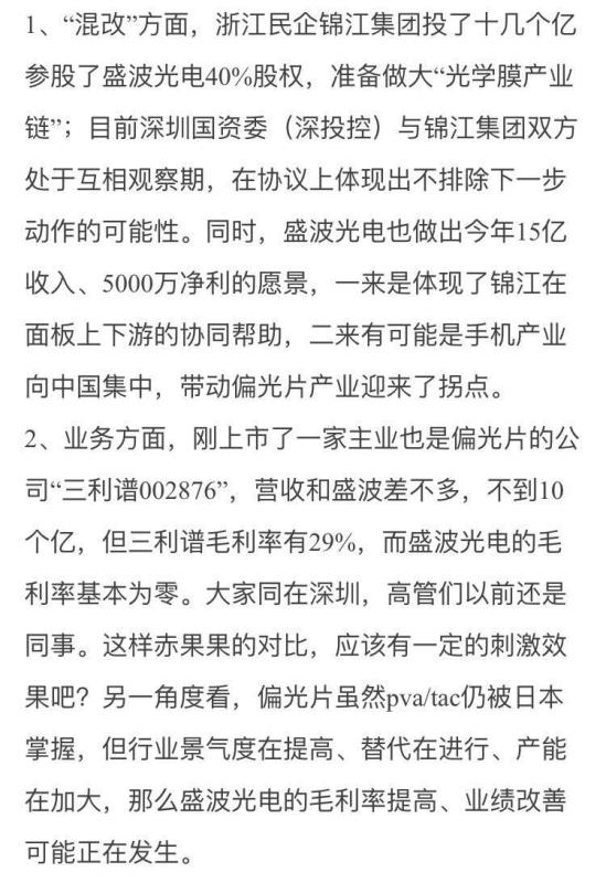 先说说今天NB闪闪的深纺织(000045)。以前我就写过深纺织的逻辑,因为它是一个优质的壳,我至今严重怀疑深纺织会被深圳地铁借壳。这货叫纺织,和织布木有半毛钱关系,主营业务是液晶显示用的偏光片(自有知识产权),算是OLED概念。本身这货没啥负债,主营业务盈利,特别是刚出的中报显示其净利润为1445.78万元,同比增长148%!为什么这么赚钱?