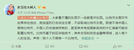 这一决定发出后,巨人网络董事长史玉柱发微博称,不该过分妖魔化比特币,大家看不懂的东西不一定都是坏东西。比特币交易环节如果存在违法,就该猛烈打击非法交易,不该取缔比特币交易。即使不准中国人拥有比特币,外国人仍会继续持有的,甚至将来有些国家政府的外汇储备可能会配置比特币。比特币基于的区块链技术,将来会深刻改变金融等领域,进入每个人的生活。同时,他还声明个人不拥有一个比特币。