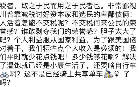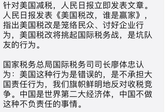 综上所述,如果川普成功,利好中国,毕竟我们是贸易顺差。如果失败,短期利空中国,长期利好。所以,这事对中国的影响比较有限。至于会不会倒逼中国政府减税,官媒义正言辞的说了,我们不会干这么不负责的事。但是机构化减税,就像结构化加息一样,还是要继续推进的。另外,中国有那么多公务员,还要搞那么多基建,地方政府也是赤字财政,发地方债,有的还款还是问题,减税这些钱哪来?历史经验告诉我们,一般别人不好都能影响咱,别人好一般都和咱没关系,自己心里难道没点儿逼数吗?