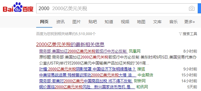 昨天上午盘中,有一条关于2000亿美元关税的一条假消息在网络上肆意传播。由于其假得太离谱,我特别写了一篇文章放在小号“菠菜的星空”(ID:bojinlicai)里,这里就不占用篇幅了。总之,市场信心相当脆弱,截止目前菠菜发稿为止,双方依旧在喊话,并没有2000亿实锤落下。有意思的是,我刚在百度上打“2000”这个数字的时候,就是下面的画风↓