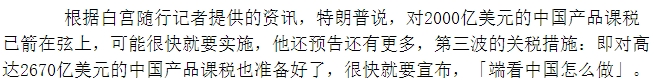 特朗普向来是把最坏的预期提前放到谈判桌上和你all in,然后再做退让。2000亿再追加2670亿基本等于中美不再有贸易往来。如果美国总统的权力已经可以动摇美国所谓“民主”的立宪精神,很可能特朗普将面临的内部压力更大。而事实上,从今年年初XX站开打到现在我国一直在进一步扩大改革开放的力度,芯片也在一定程度上找到了美国产品的替代。但是对于美国而言,中国这么大体量的供应商,他们很难在全球范围内找到替代。因此,这些关税不是加给中国的,而是要美国工商企业来分摊。