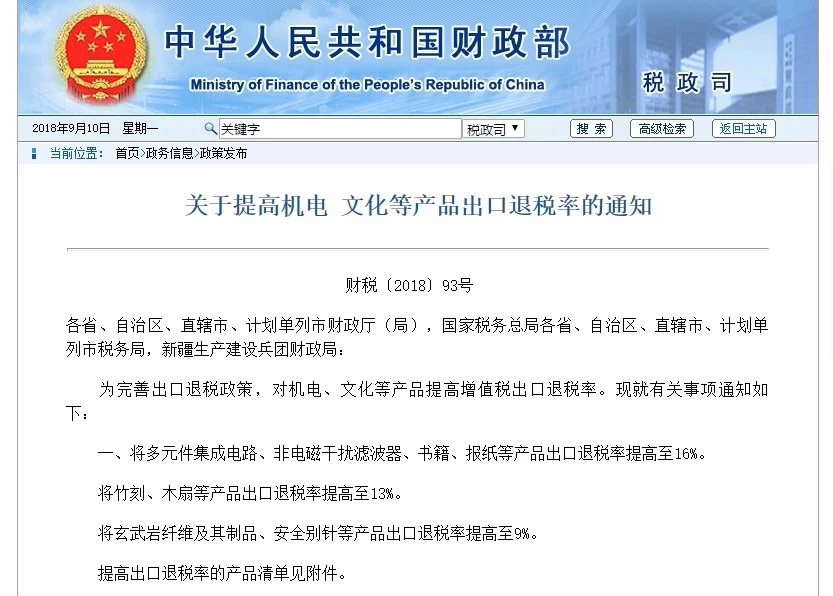 财政部网站公布了提高机电、文化等产品出口退税率,其中如下图所示,第一条就是将多元件集成电路、非电磁干扰滤波器、书籍、报纸等产品出口退税率提高至16%。这说明我国明确的产业扶植政策在对冲XX站影响;
