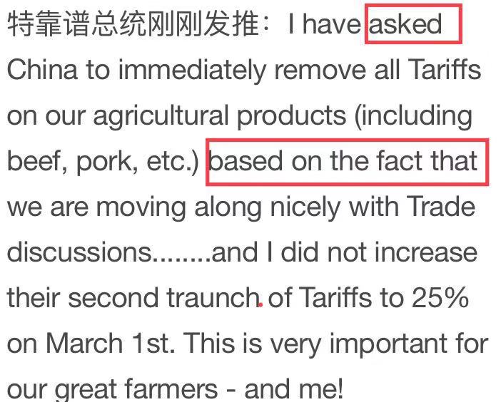 川大爷的急性子又犯了,发推特说:我已经要求熊猫立即取消农业税(包括牛+猪的),原因是我们双方谈的还挺好,本大爷3月1日也给了你们台阶下,没有对第二批名单加25%的关税,这是事实(based on the fact)。这事对于我们美国伟大的农民阶级和我自己都非常重要。
