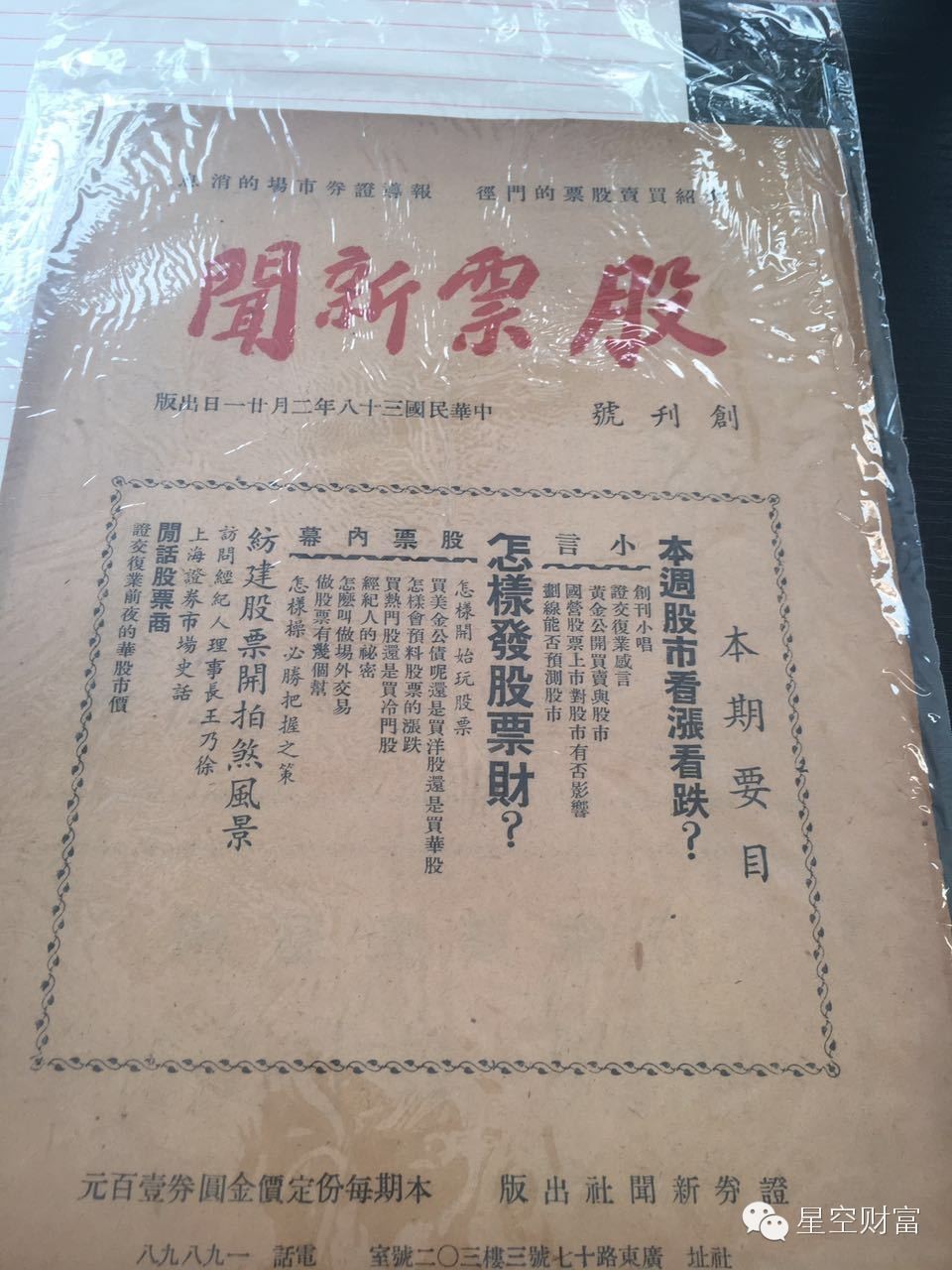 今天菠菜收盘后去了高晓松老师担任馆长的杂·书馆。由于是当天预约的前50名,所以可以借阅一本古籍,我就找了一本民国时期的期刊《股票新闻》,如下图(以下若干图片来自菠菜手机,你要是打算盗图,我一定和你打官司,不谢):