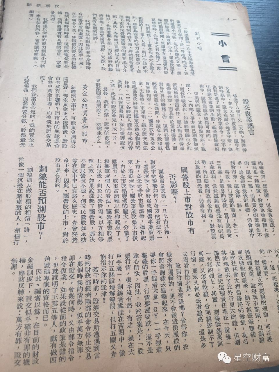 看这封面,貌似有点咱自媒体的风格吧?我说明一下,民国三十八年是1949年,也就是蒋公以及党国最后的日子。之前证券交易所是停业的,现在复业了,所以开始搞这种股评小报。这时,证券市场开始推行用金圆券代替法币来为个股标价。原因是法币已经严重通货膨胀。
