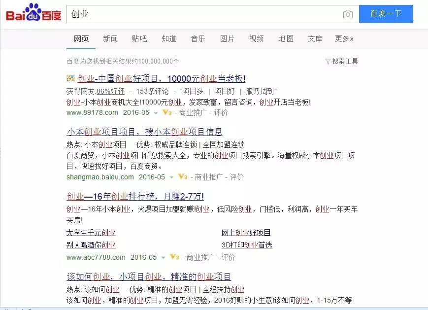 PS:我今天可没说万众创业,大众创新的坏话。不过真心觉得创业是个小众的事,你们说呢?下图是菠菜在百度上搜“创业”的结果……所以,今天就到这里,让我去吐一会。