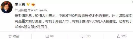 今天股市如何且放一边,但一定是一场外资进来共同分享中国经济成果(共担风险)的一个元年。今天还传出了取消QDII投资股市的比例限制(大霄解读为利好,我到是觉得是中性,歪果仁万一看空,就没有必须半仓的限制了),这些都是在为接下来的融入国际金融市场的创造制度条件。现在我依旧找不到过度看空的理由,至于他们说的三浪四浪,谁愿意数谁数。