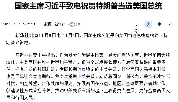 今天晚上XDD发了贺电(这也就是一常规动作,不算什么)。对于一个商人,他的爱好无非就是交易,确切的说是能占到便宜的交易。国与国之前的友谊和撕逼主要就是双方不能做太不平等的交易。川普多次演讲都拿中国举例,看来他很想挑战一下中美贸易。毕竟人民币贬值,就是主动做空美元,就是在国际贸易上不放弃自身优势。目前,指望短时间内川普做什么推动中美贸易的事,不太可能。但有一点,在外交上,我天朝很可能用政策和贸易利益来交换。