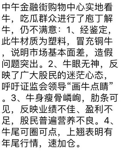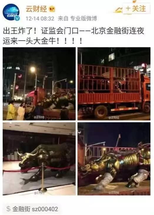 最近各个股票群围绕着金融街购物中心摆什么这个话题,展开了激烈的段子手竞赛。那么今天最新的那头牛是哪来的?其实就是华尔街的那头铜牛的一个复制品。那么就说说华尔街那头牛的段子吧。意大利西西里岛的一位艺术家,阿图罗·迪·莫迪卡(Arturo Di Modica),一天,他闲逛来到华尔街,然后灵感就来了。当时的华尔街已经是世界金融和股市的中心。他暗下决心,要把自己的作品摆放在这里定,说不定这会给他带来好运。于是,他设计了一头铜牛打算在1989年的圣诞节,把它摆在华尔街证券交易所前,祝福股市来年一牛冲天。1989年12月15日午夜,莫迪卡用一辆大卡车,将他这头长5米、重达6300公斤的铜牛,偷偷运到华尔街证券交易所门前,安放在一棵巨大的圣诞树下,他盼望着第二天一早奇迹就会发生。次日一大早,他跑到证券交易所边上,果然他的铜牛已经被记者和警察围得水泄不通,从外面根本看不到牛了。这样一种场面,使本来就显得狭窄的街道更加拥挤。更为牛气的纽约市政府,在盛怒之下,要求莫迪卡赶紧把铜牛拉走。然而,就在这时,百老汇大街南端的保龄绿色公园的负责人找到莫迪卡,让他把铜牛拉到他们的公园里。莫迪卡雕塑了铜牛,他本人也还真有点有点牛气。白给?没门!他要把铜牛卖给开价最高的买主,而且还有一个附加条件,无论是谁买了铜牛,一定要把它留在原地,并且必须把铜牛捐赠给纽约市。此后几经周折,铜牛还是留在了原地,成为纽约市的公共财产,不准任何人买卖,莫迪卡自己也拥有了铜牛的肖像权。(这段有点长,可以不看↑)