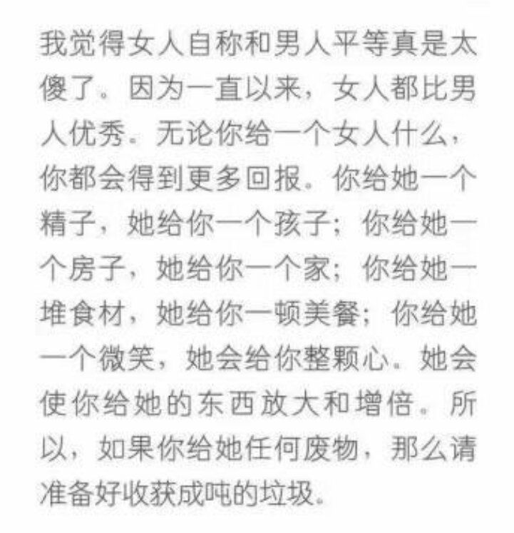 看到很多人发图片说38妇女节多逛街多看帅哥多对自己好一点,比如做个美容打个玻尿酸神马的,貌似女人在社会中就被丑化成这样一种生物,买东西消费就能开心?38妇女节已经演变成一种纯粹的女性产品集体消费日。确切的说是把女性“物化”,而悲哀的是很多女性自己正是这种观念的推手。(虽然阅读我文章的男性占绝大多数,但如果你家有女儿,在富养之外,一定有机会培养女孩子眼界、知识、胸怀,你家的小棉袄才能真的抗寒。)