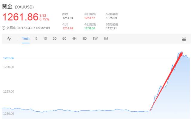 好了,言归正传。川普的这“59连炸”,不仅让国际局势再度紧张,国际市场更是坐立不安。避险资产价格急速走高,现货黄金大涨至美国大选以来新高,飙升近20美元至1267美元。