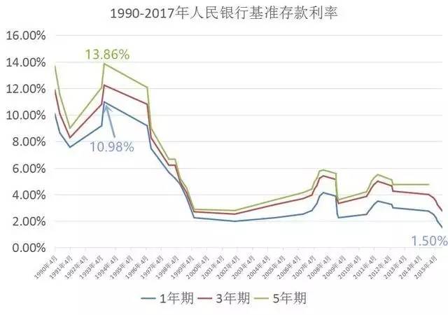 当年的存款利率确实是很高的!记得我妈曾经跟小白菜我吐槽,90年代初的时候(就是我们看到表里利率最高的那个点),我们家里定存了一笔钱,在还有几个月到期的时候,我家亲戚为了给孩子娶媳妇来借钱,结果我妈忍痛借给了他,损失了一大笔利息,至今耿耿于怀!大家可以看看,那个时候的年化收益真的是秒杀如今的一切宝宝产品好不好!