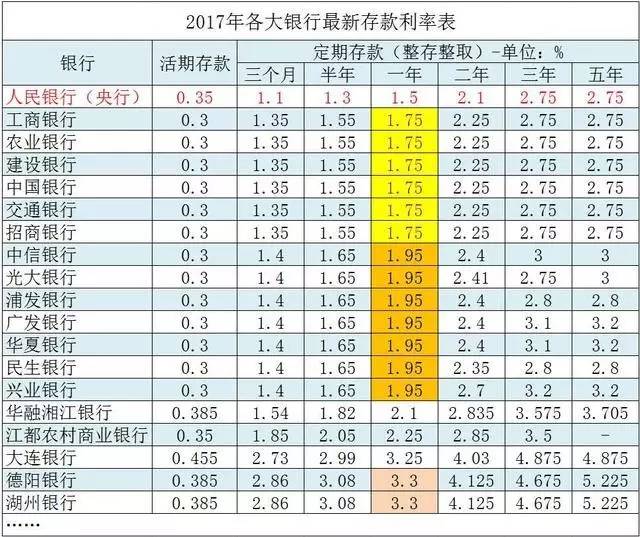 通过这个表我们可以看到,2017年,央行一年定期存款的基准利率是1.50%。四大行一年定期存款利率为1.75%。而以光大、民生为代表的大型股份制银行一年定存利率为1.95%。而像德阳银行这些小型银行为了吸引一年定期存款利率为3.30%。