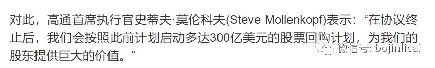 【结局】:高通支付恩智浦20亿刀分手费,启动300亿美元的股票回购计划。