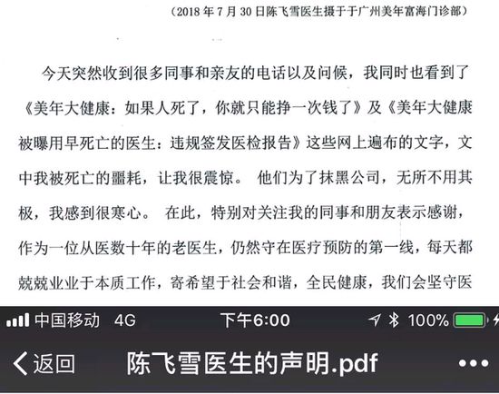 美年健康涉嫌利用早已去世的医生陈飞雪名义,违规签发医检报告。真相→自媒体所说的这位陈飞雪医生一直健在,自己还出面拍照并发了澄清公告↓;