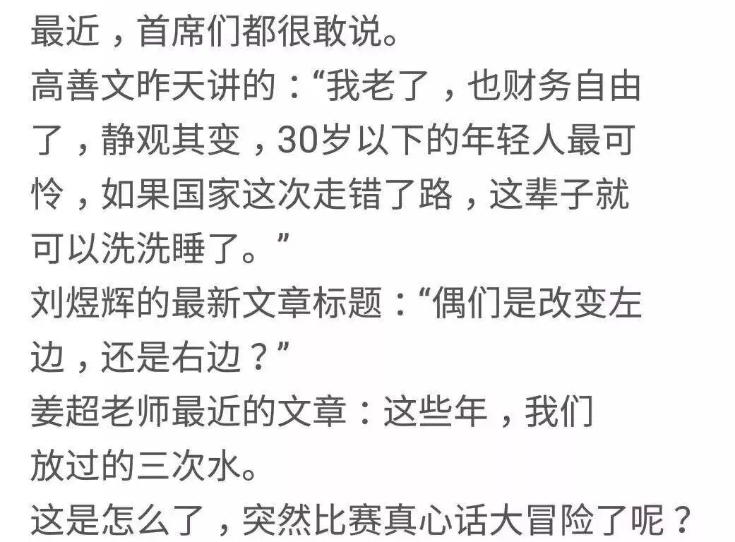 高老师的言辞很恳切只是说到了一个结论让人听上去咋舌,30岁以下的年轻人将来的日子更不好(如上图)。不要因为学者的分析就给人家道德绑架说不爱国,理性对待不同声音。从中可以感受到现在精英阶层做什么事已经不着急统一思想了,而原因让不同的声音发出来。无论如何只要坚持开放,无论是思想上的还是贸易上的,对现在的中国是好事,应该支持。