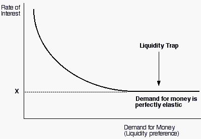 凯恩斯描绘过这样一种情况,中央银行投放基础货币导致利率不断的下降直到无法再低的时候,任何货币量的增加,都会被社会以“闲置”的方式吸收(凯恩斯当时举例是储蓄)。也就是单纯依靠基础货币投放无法刺激经济,国民总支出和利率水平都没有因为货币不断投放而改变。这种情况,在宏观经济学上被称作“凯恩斯陷阱”。