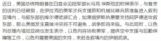 前两天,美军说不排除使用战术核武器,翻译成好理解的语音,就是准备用小型核弹头。然后俄罗斯军方说如果俄罗斯的军队在叙利亚遭到重大攻击,授权军方可以使用核武器。美国的核潜艇已经开到了叙利亚,俄罗斯也在中东进行军演。我认为普京绝不是随便打嘴炮发推特的领导人,核武器战争一触即发。