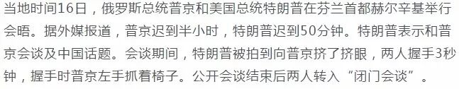 但是,叛军这些土贼能发展到今天还不是因为背后有美国、以色列这些老板撑腰?这里插个话题,今年7月16日特朗普和普京有一次闭门会(如上图节选的新闻报道),媒体不知详情。不过目前从结果上看是没谈拢。特朗普上任以来一直想缓和与俄罗斯的关系,因此多次约普京,据说今年还要再勾搭一次,因为特朗普希望俄罗斯能倒向美国。要感谢美国是个民主国家,不少人借通俄门这事想拉特朗普下台,因此美俄会谈一直没有进展。