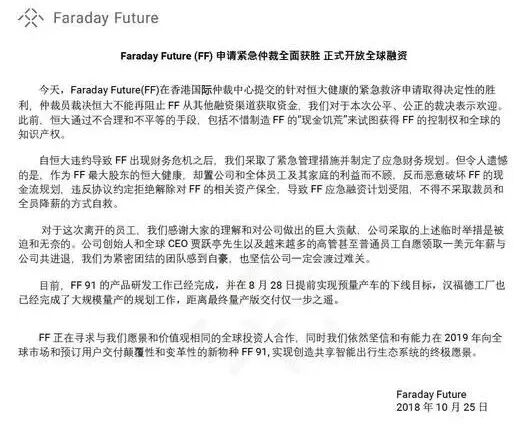 先科普一下,紧急仲裁是正式仲裁前的一项临时济助措施,目的是为了保持公司现状。因为没有钱,不是FF量产的问题而是整个公司要破产了。最终的仲裁结果还没有出来,这事还有下集。