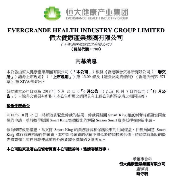 先来看看香港国际仲裁中心给出的仲裁结果(如上图恒大健康公告所示):