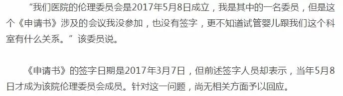 贺建奎本次实验是有《深圳和美妇儿科医院医学伦理委员会审查申请书》,上面有7人签字。这个实验是从2017年3月份开始,而其中一位签字人员却表示,当年5月8日才成为该院伦理委员会成员。中国特色的后补手续,是否暗示着14亿人口的超级大国人命如此不值钱?如此廉价?