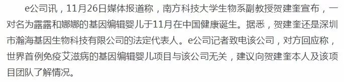 居然有人看了这条消息还去炒了一把基因检测相关概念,脑子是不是被驴踢了?难道国家不会为了此事出台相关法律法规吗?也许对整个鱼龙混杂的基因检测市场是个出清的过程,该板块的利空正在路上。涉及伦理问题,不是国内的事,而是全人类共同的责任。我看到朋友圈恐慌的并不是如何抓到贺建奎此人,而是担心后继者会不断涌现。