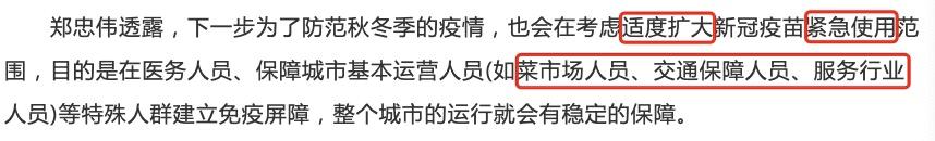“下一步为了防范秋冬季疫情,也会考虑适度扩大新冠疫苗紧急使用的范围”。